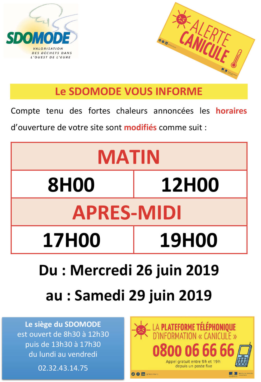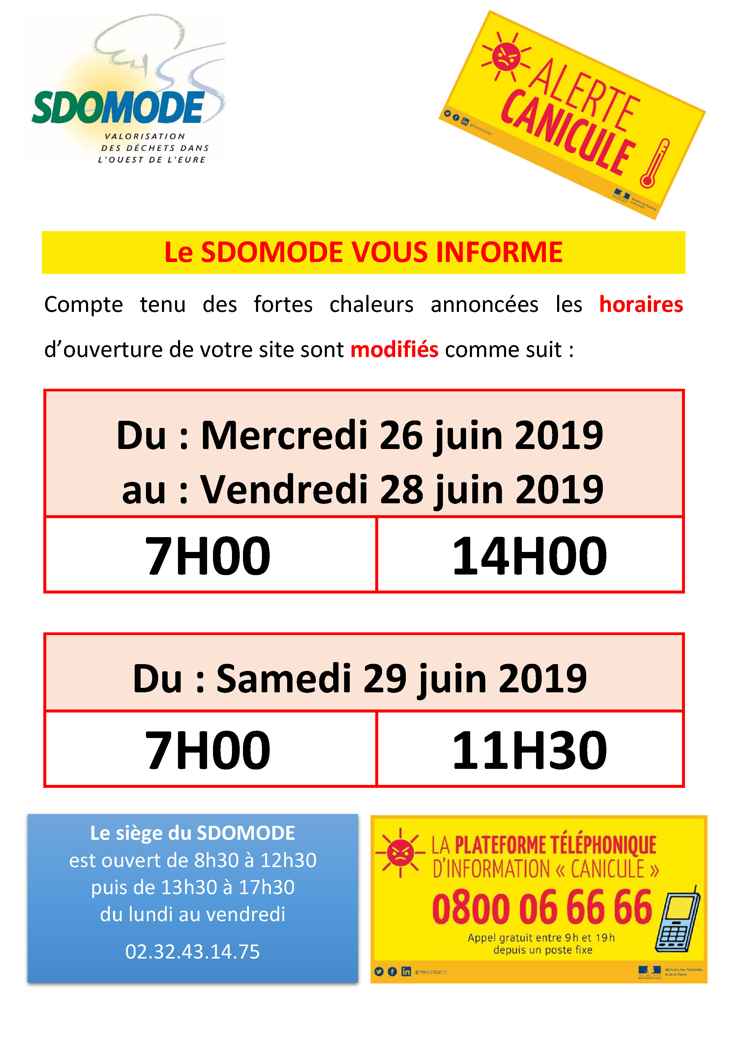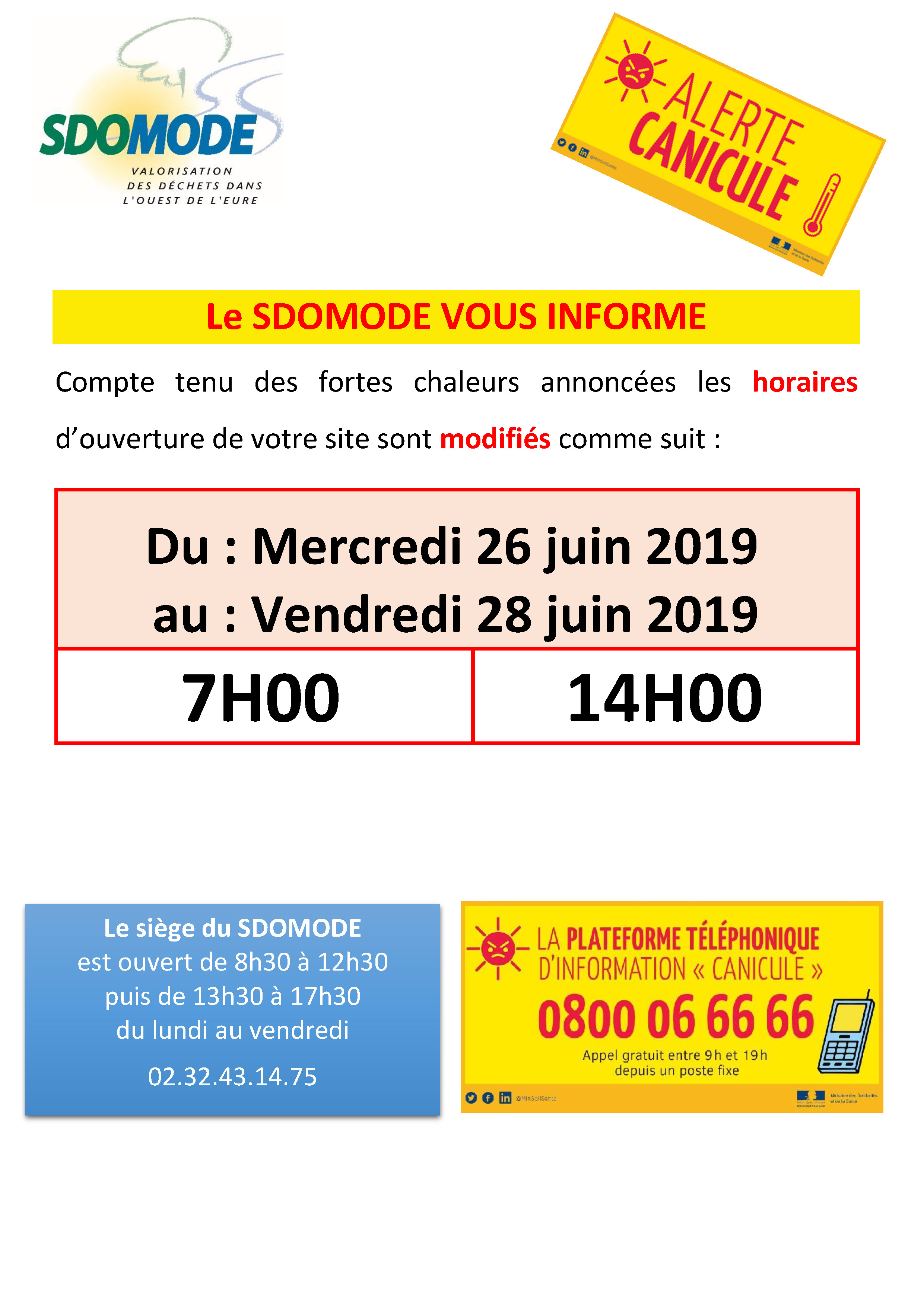 Un épisode de canicule est annoncé du mercredi 26 juin au vendredi 29 juin 2019. Des horaires sont aménagés pour les sites techniques ouverts au public de mercredi à samedi.